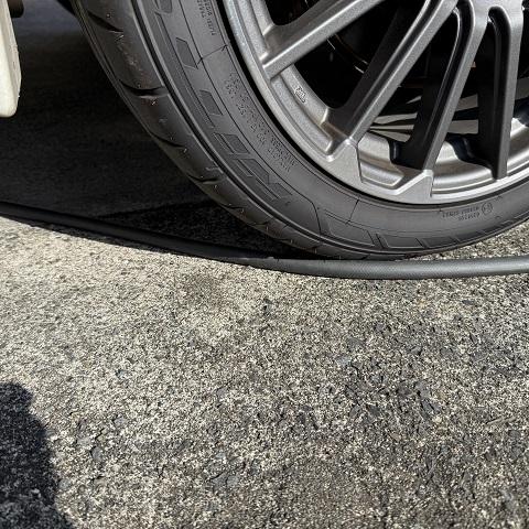 洗車時に反対側を洗おうとホースを回すと写真のようにホースがタイヤに挟まり引き寄せることが出来ません。タイヤとホース、互いにゴムの素材なので引けば引くほど挟まって毎回外しに回る事になりますよね。