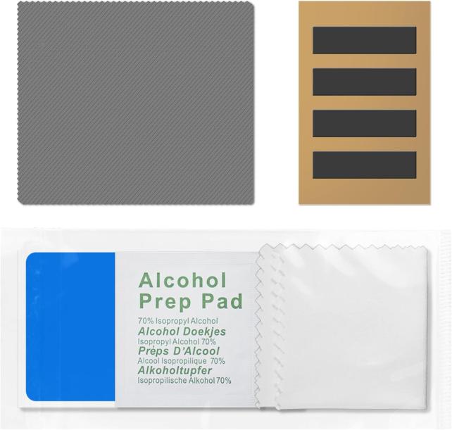 パッケージの中には、マグネット固定具、アルコールパッド、白いクリーニングクロスが一つの袋に入っていて、別途大き目のグレーのクロスが入っていました。
