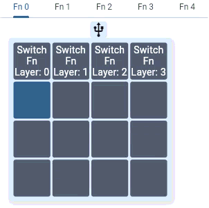 キーボード上部の4キーをレイヤー切り替えボタンとして割り当てた場合、1レイヤー当たり3x4の12キーが使用可能となる。