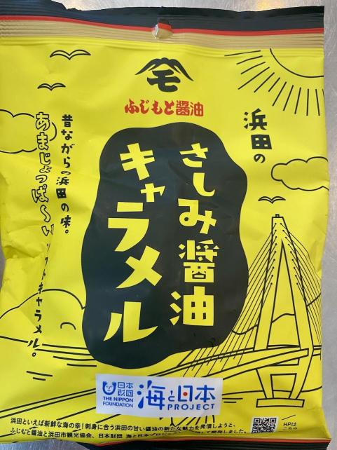 浜田で古くから愛されるふじもと醤油の「さしみ醤油」を使用した新感覚のソフトキャラメルです。みたらし団子のようなあまじょっぱい味が特徴で、口に入れた瞬間に絶妙な塩気と甘みが広がり、とろける食感をお楽しみいただけます。