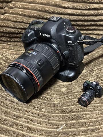 折角なので本物のEOS 5D MarkIIと並べてみましょう。本物の方にはEF28-80mm F2.8-4Lを装着しています。