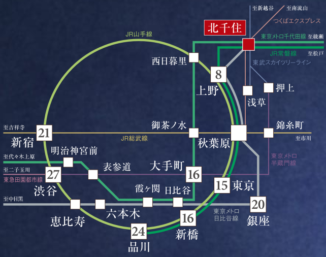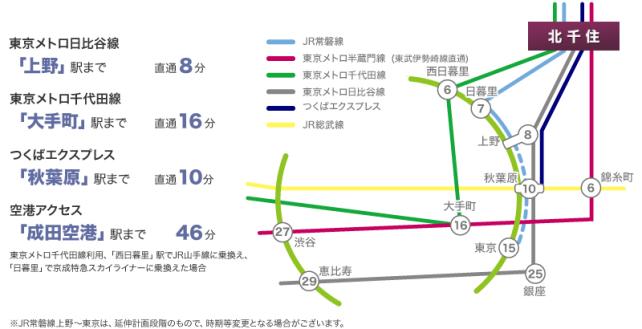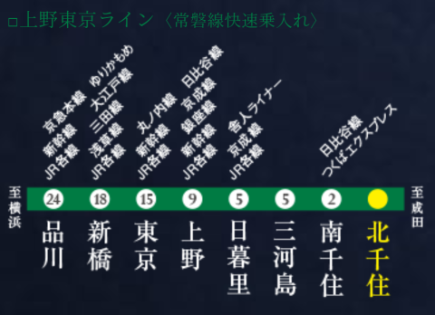 上記の駅を考えた時に北千住は下の図でもわかるように非常に路線が多いのです。