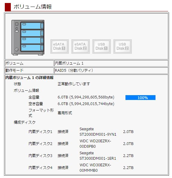 ボリュームサイズは、RAID5構成なので1本分のサイズがパリティの分となり、6TB。