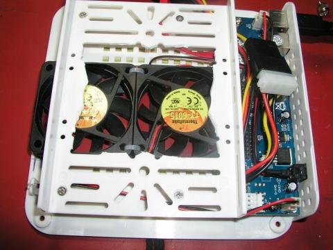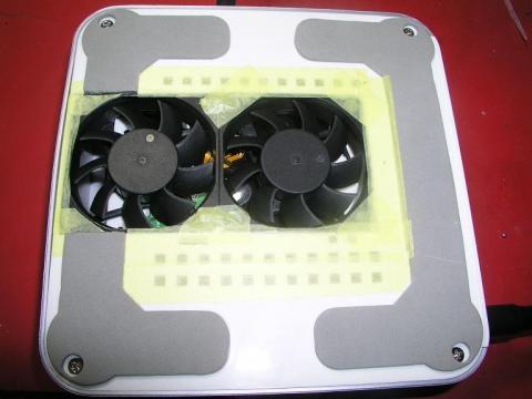 プラなので、加工は非常に簡単。接着剤も使えるので、テキトー極まるDIYで6センチファンを二基設置してみました。
