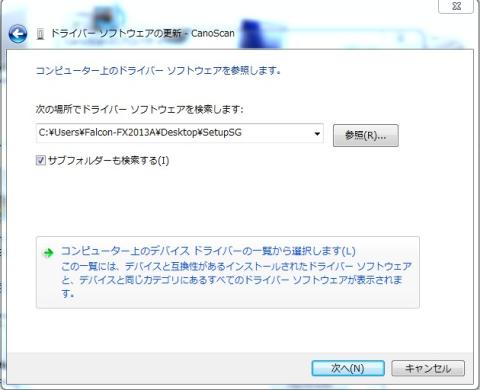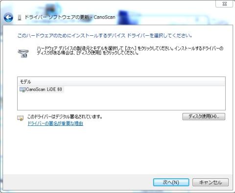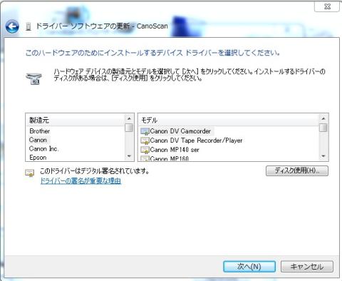 キヤノンを選び ディスク使用でドライバーがあるホルダーを選択