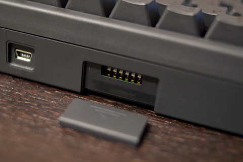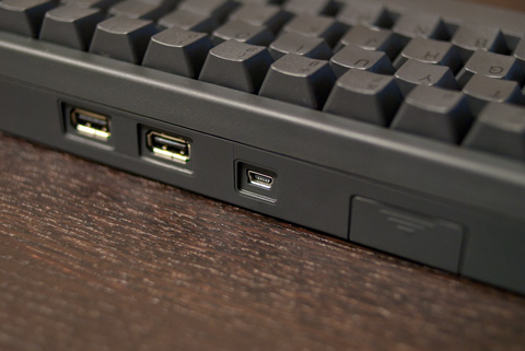 本体との接続用USBポート×1、HUB用のUSBポート×2、カスタマイズ用スイッチがあります。
