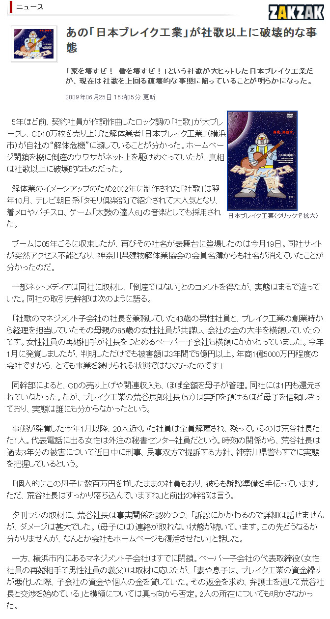 「家を壊すぜ! 橋を壊すぜ!」という社歌が大ヒットした日本ブレイク工業だが、現在は社歌を上回る破壊的な事態に陥っていることが明らかになった。