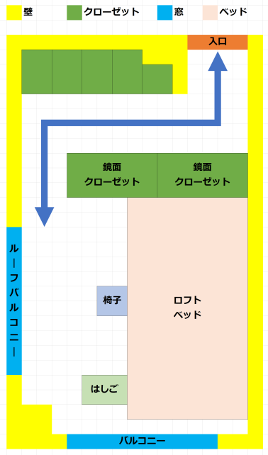 そうすることで、下図のように、クローゼットとクローゼットの間の通路を抜けて進みます。