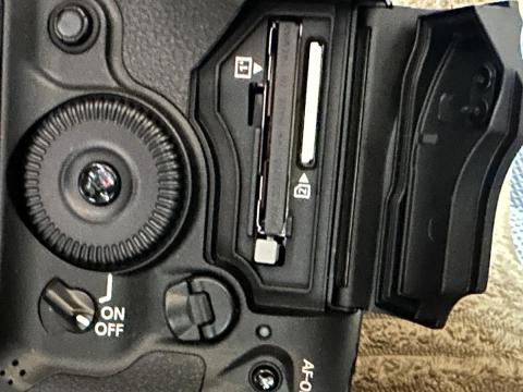 EOS-1D MarkIIIで採用された防塵構造を踏襲しているため、メモリーカードスロットの蓋も他のEOSシリーズのようなスライドロック型ではなく、レバーを起こしてロックを解除する形です。
