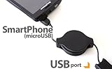 普通の巻き取り式MicroUSBケーブルです。 スマートフォンの転送や充電に使えます。 巻き取り式の割に少し長めです。
