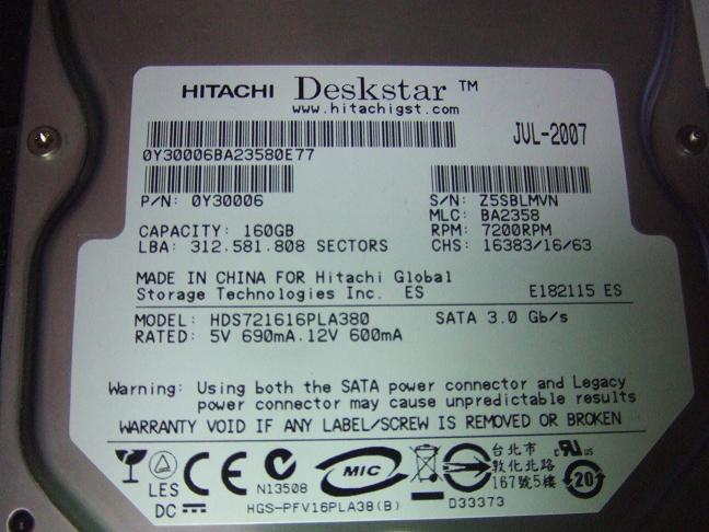 あと比較する日立Deskstar160GB(HDS72161PLA380)