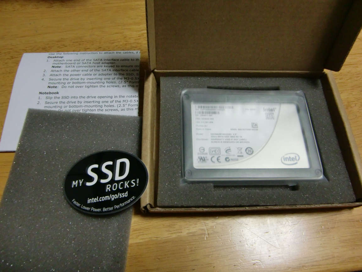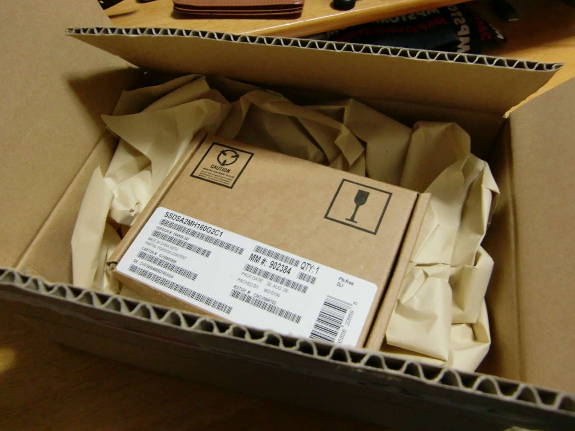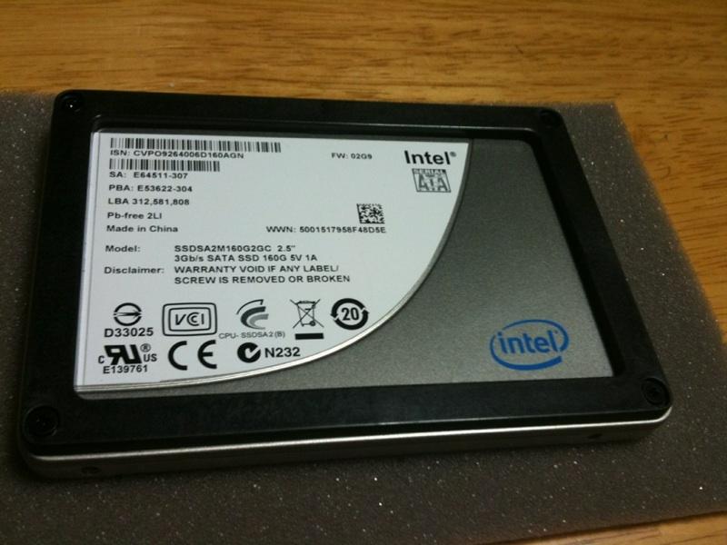 Intelの最新SSD160GBモデルです。到着しました!とりあえず外観を。思ったよりも薄く、スペーサーで厚みを調節して9.5mmにしているようです。軽く...