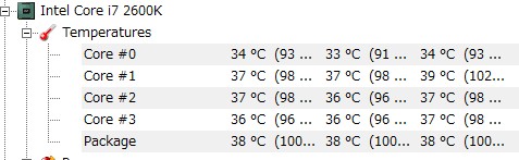 CPUコア、CPUケース、マザーボードのセンサーなど ここではCORE温度