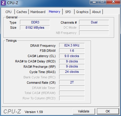 DRAM Frequency が 824.3MHzになってるから、800MHz×2のDDR3 1600で動作しているようです。(FSBが上がってるから、824.3MHz×2で、1648.6ですね。)