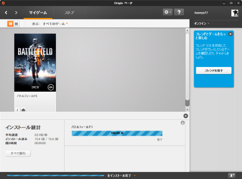 マイゲームにBF3が入っていますので、ダウンロード可能のボタンを押します。