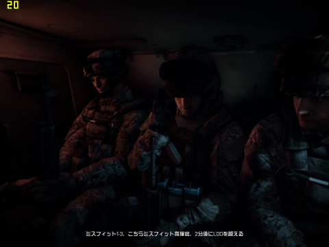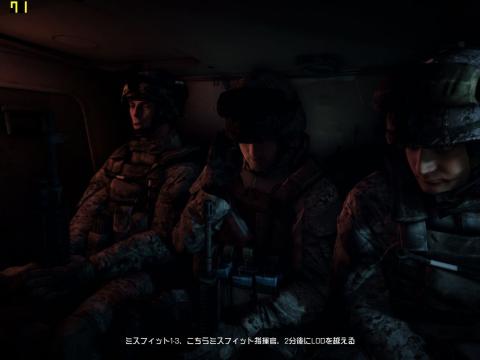キャンペーン ミッション「OPERATION SWORDBREAKER」の冒頭の、隊員たちが輸送車で運ばれるシーン を 1024x768 最高画質でのキャプチャです。