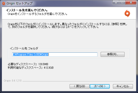 ORIGINのインストールディレクトリを指定します。変更せず次へ押します。