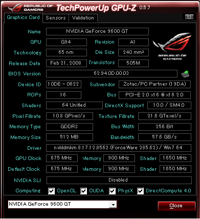 【グラフィックスカード】 GeForce 9600GT/512MB