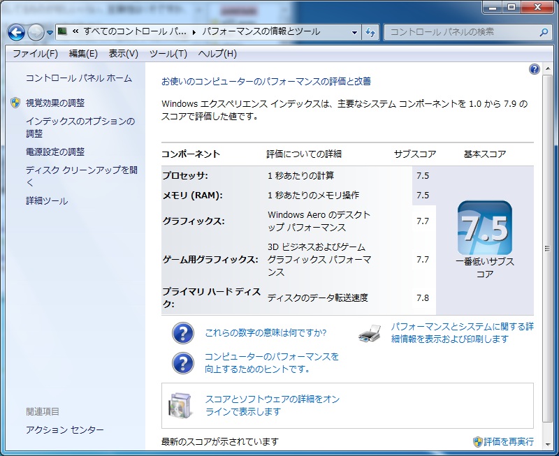 これらが終わった後に、Windows エクスペリエンスインデックスを測定してみたところ写真1のような結果でした。