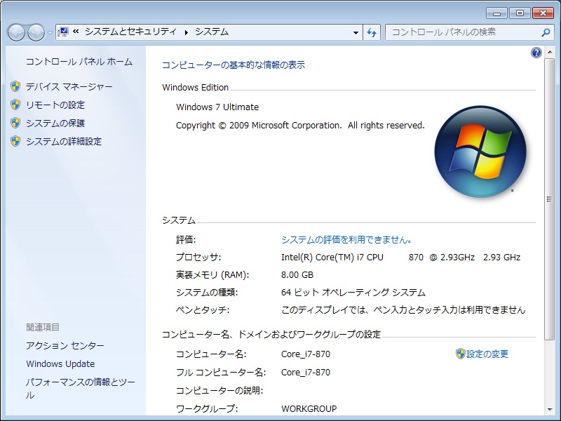 Windows7 Ultimate x64、Core i7-870であることがこれで判るかと思います。