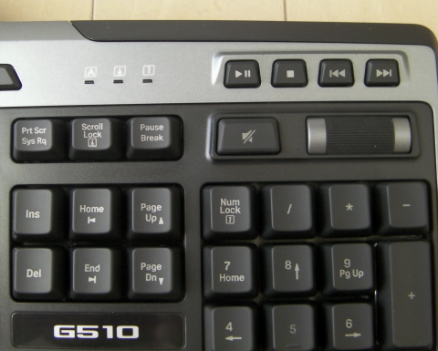 安いキーボードでも付いてる事があるし、メーカー製パソコンのキーボードによく付いていますね。便利なのかもしれませんが、私はあまり使いません。このキーボードには再生/一時停止、停止、前のトラック/巻き戻し、次のトラック/早送り、ボリュームローラー、ミュートが付いています。ボリュームローラーがわりといい感じです。