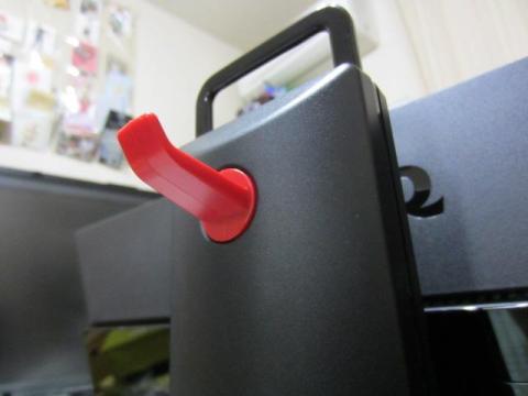 黒いスタンドに赤いフックなので、かなり目立ちます。普通、モニタ裏のフックなんて必要ないかもしれませんが、私には大助かりです。普段は、家族が寝静まってからゲームをするのでヘッドホンが必須です。いつも、ヘッドホンの置き場所に困っていました。