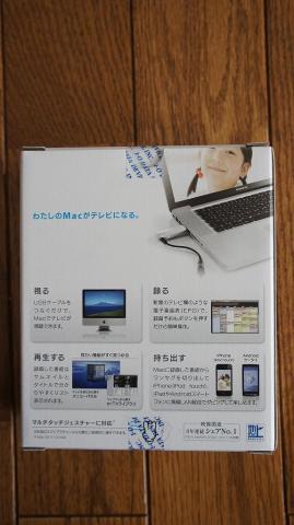 かなりシンプル。前面部は「わたしのMacがテレビになる。」という金色の文字がまず目につきます。「MacOS X LION」にも対応というのが非常に分かりやすい。他社のパッケージデザインがごちゃごちゃとした彩色や文字が多い説明的な製品が多い中、このパッケージは販売売り場にぽつんと白い空間を作りだしており、とても目立ちやすくなるよう考えられている。