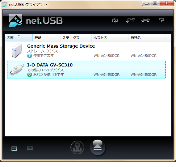 net.USBクライアントをインストールすると画像1のように、一覧が表示され、クリックすることでその機器を使うことができます。(※排他利用です。)