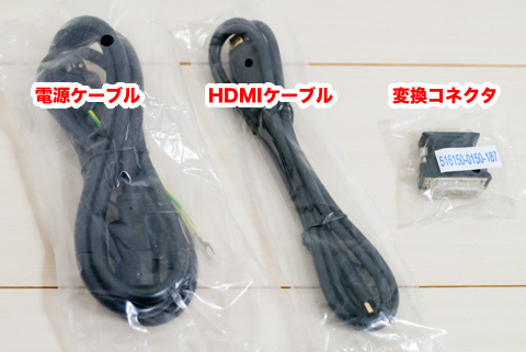 右から、変換コネクタ、HDMIケーブル、電源ケーブルです。