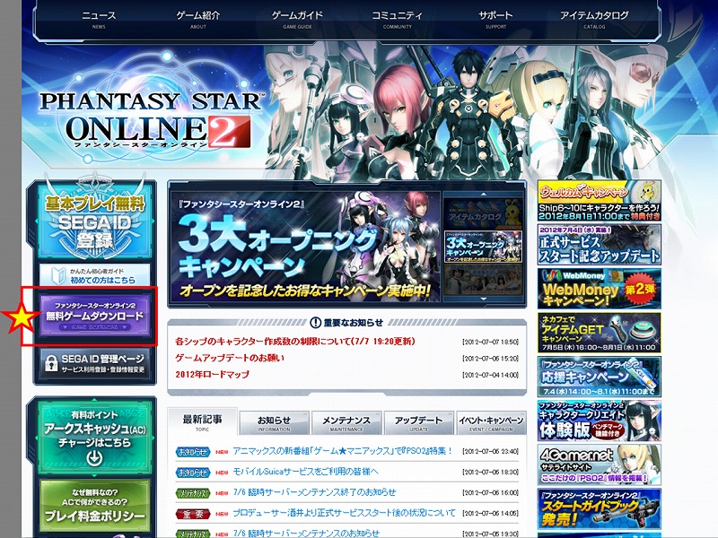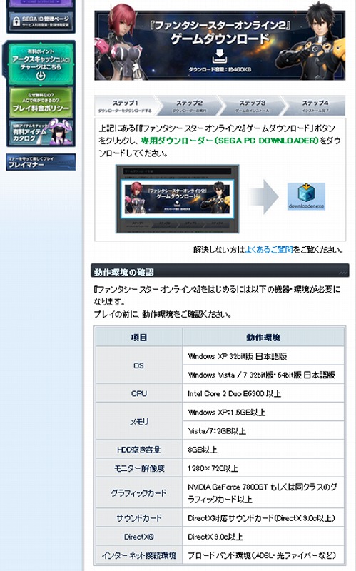 ファンタシースターオンライン2の公式サイト左側の「無料ゲームダウンロード」からゲーム本体の入手!