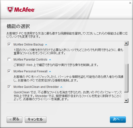 さて先ずインストール時に驚いたのは、マカフィー オール アクセスという製品の中に沢山の機能(アプリ?)が入っており、インストール時に選択出来るということ。