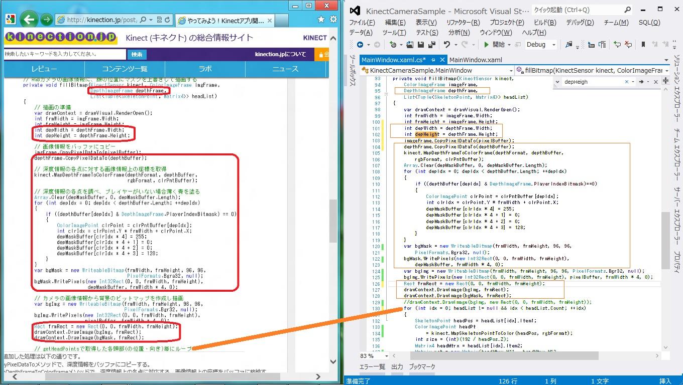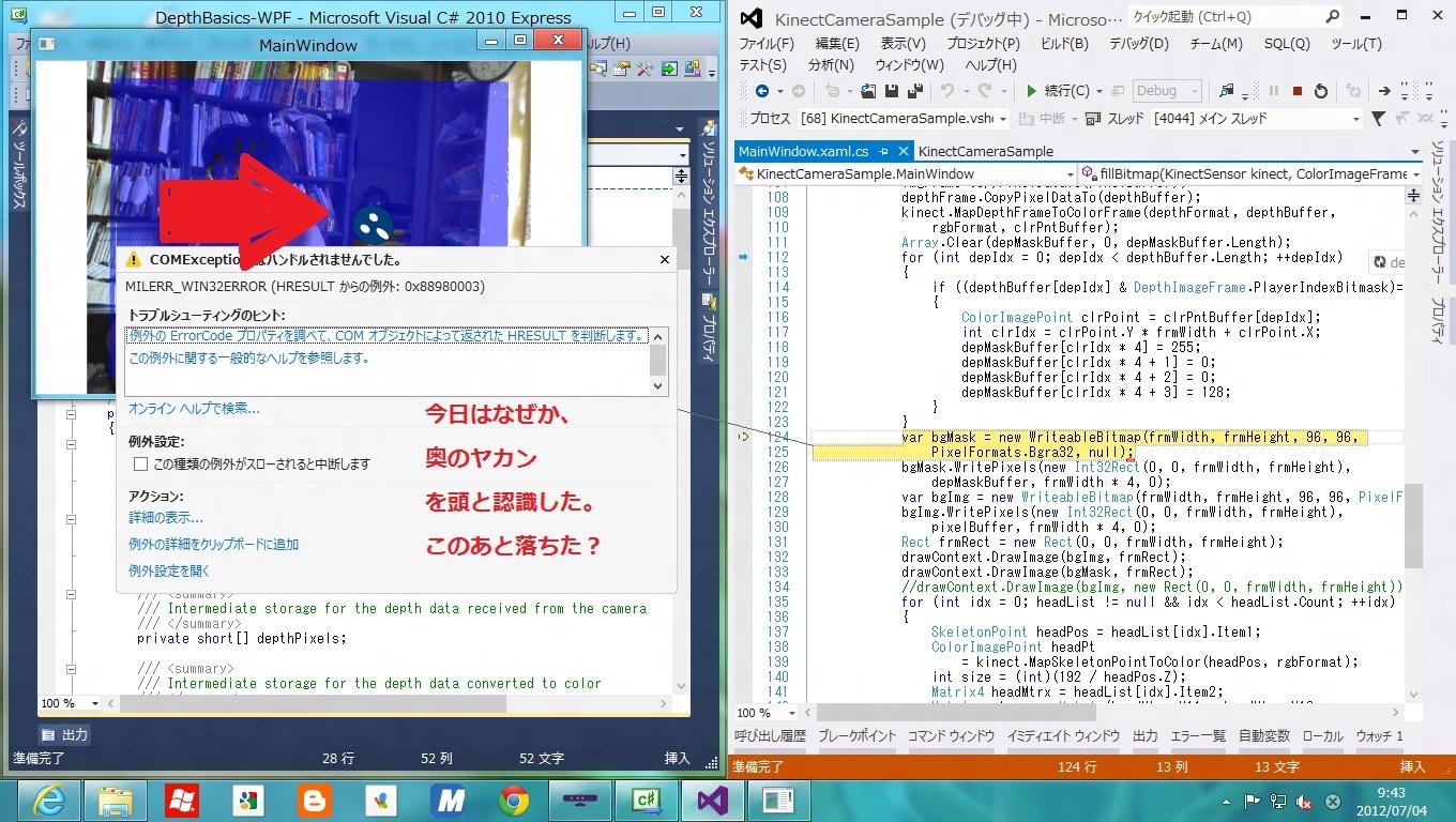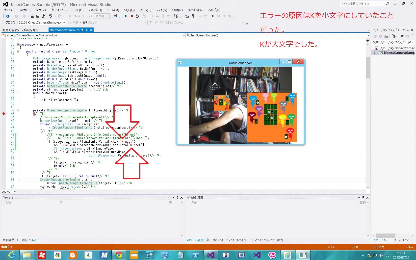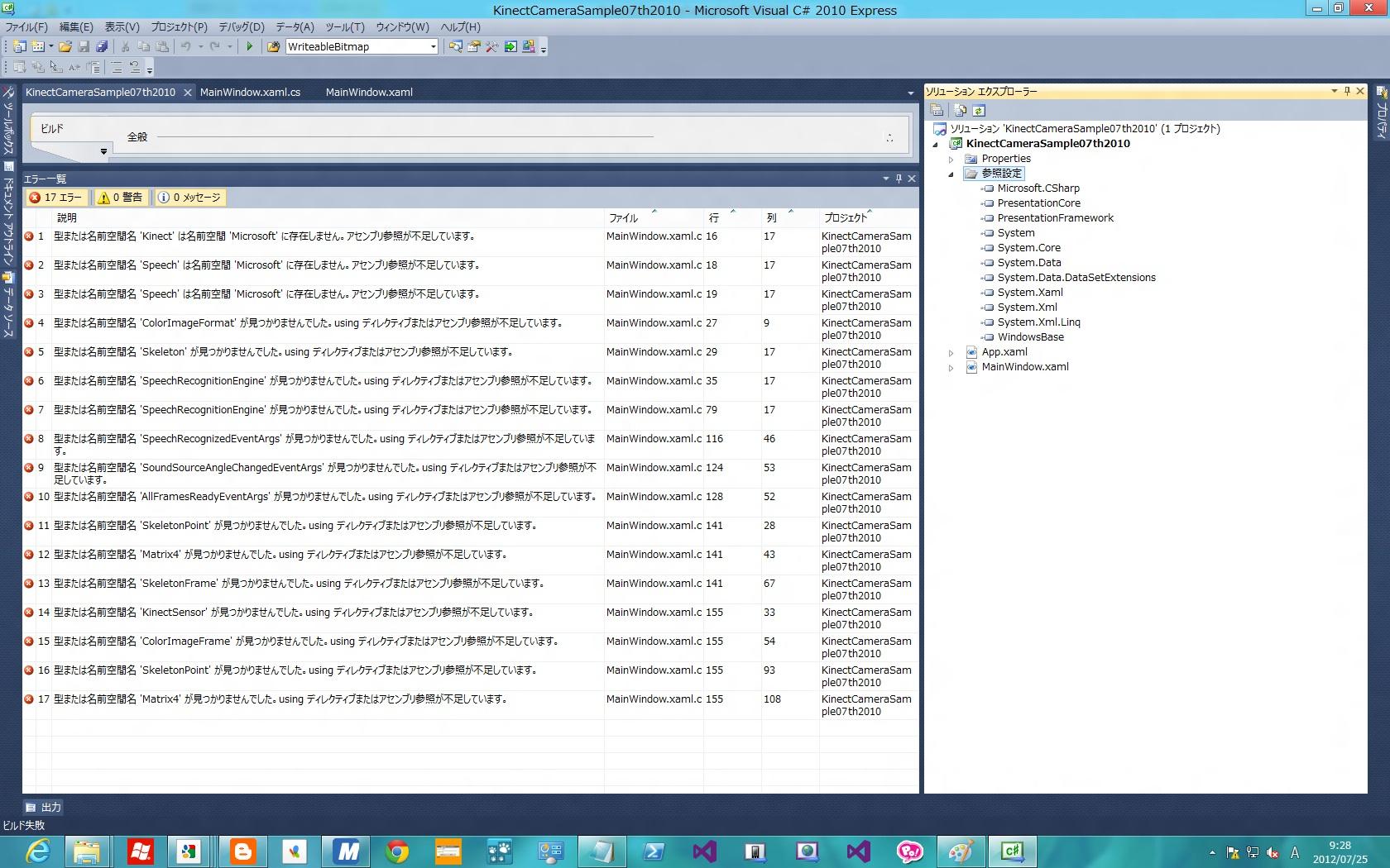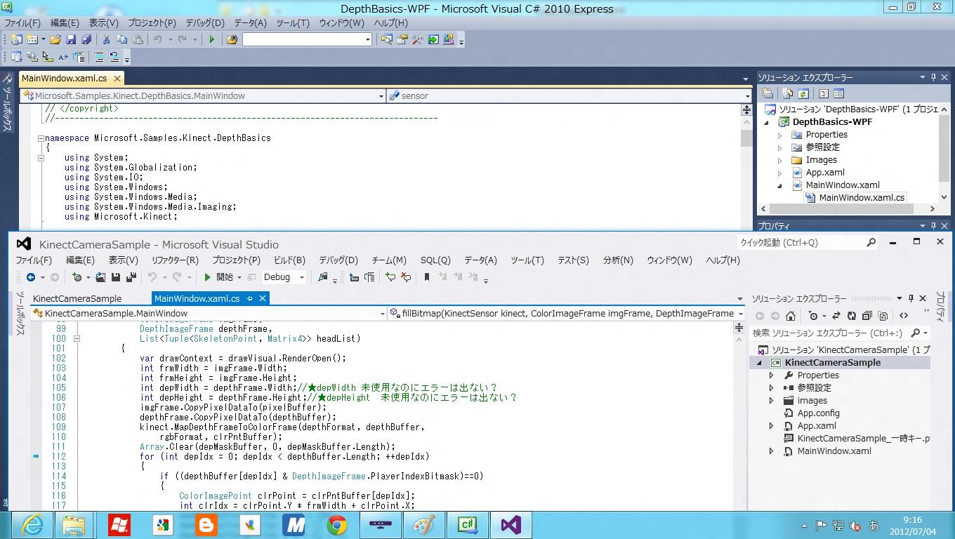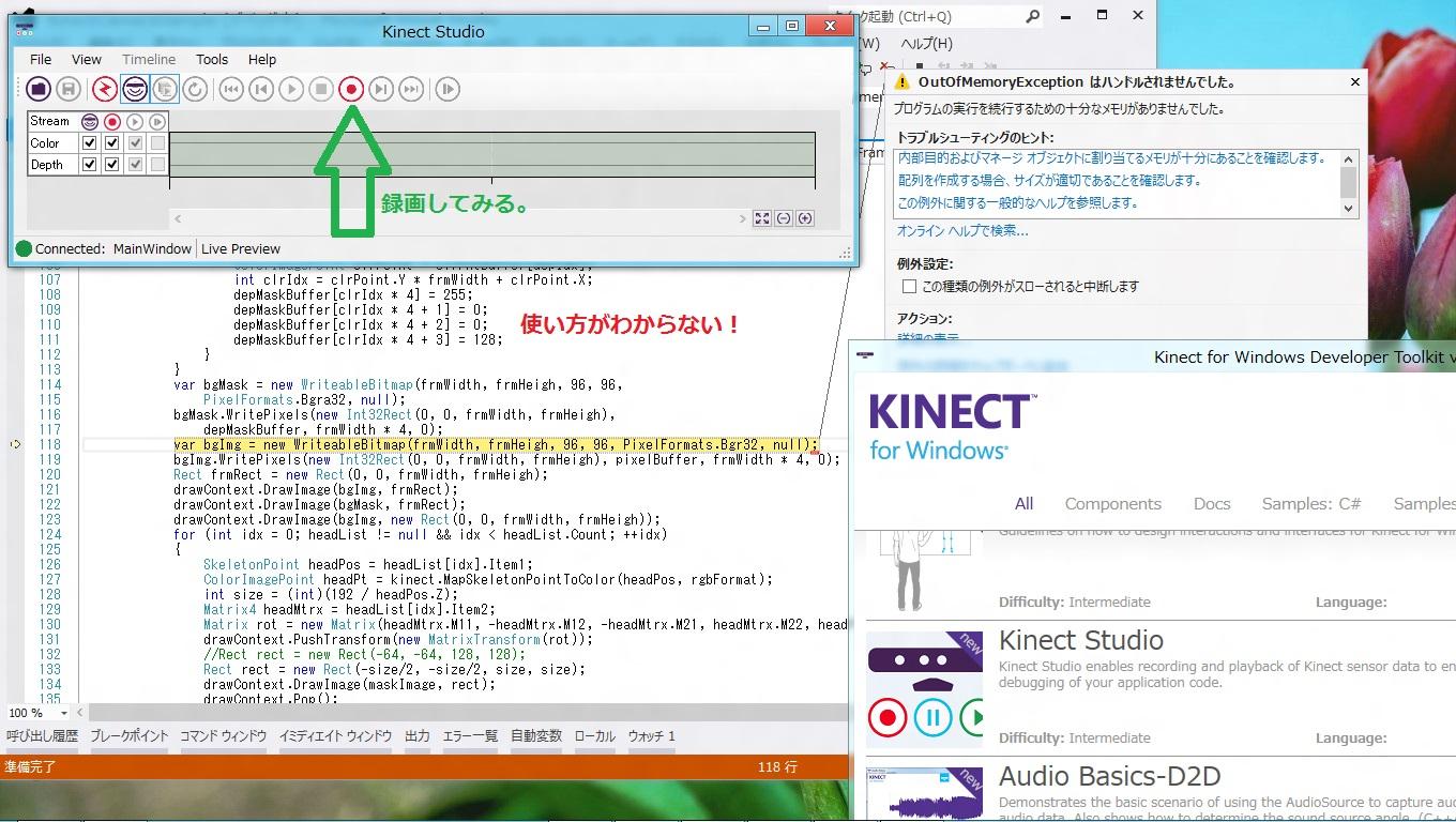 次はハンズオンテキストがそのままではエラーばかりなので、直しながらkinect の理解を深めてゆく。