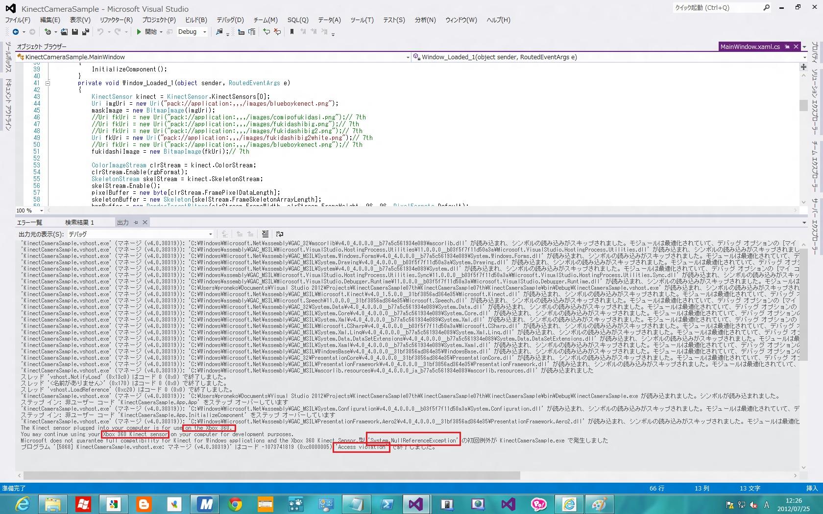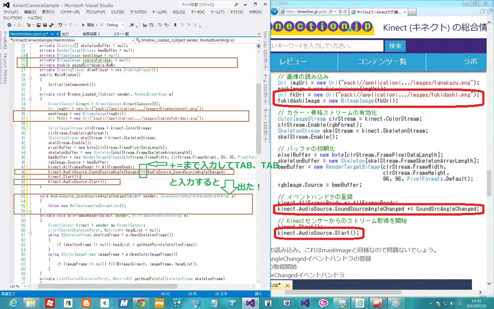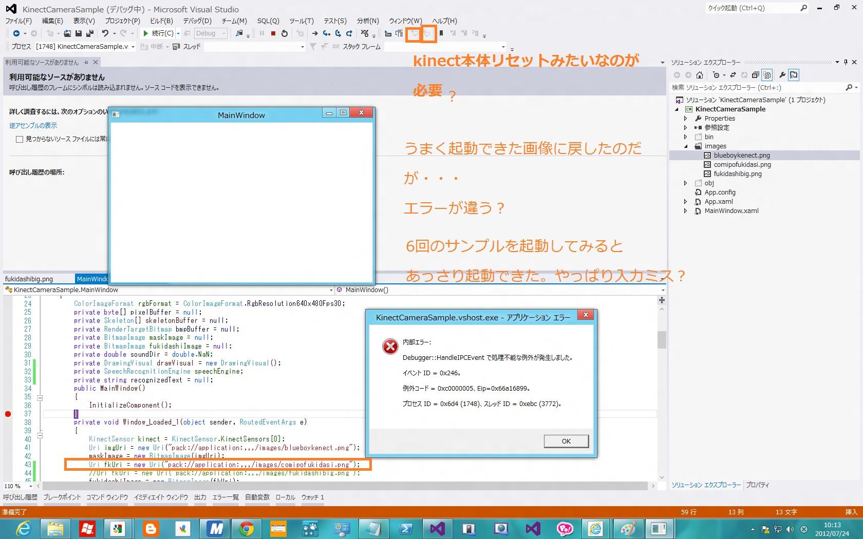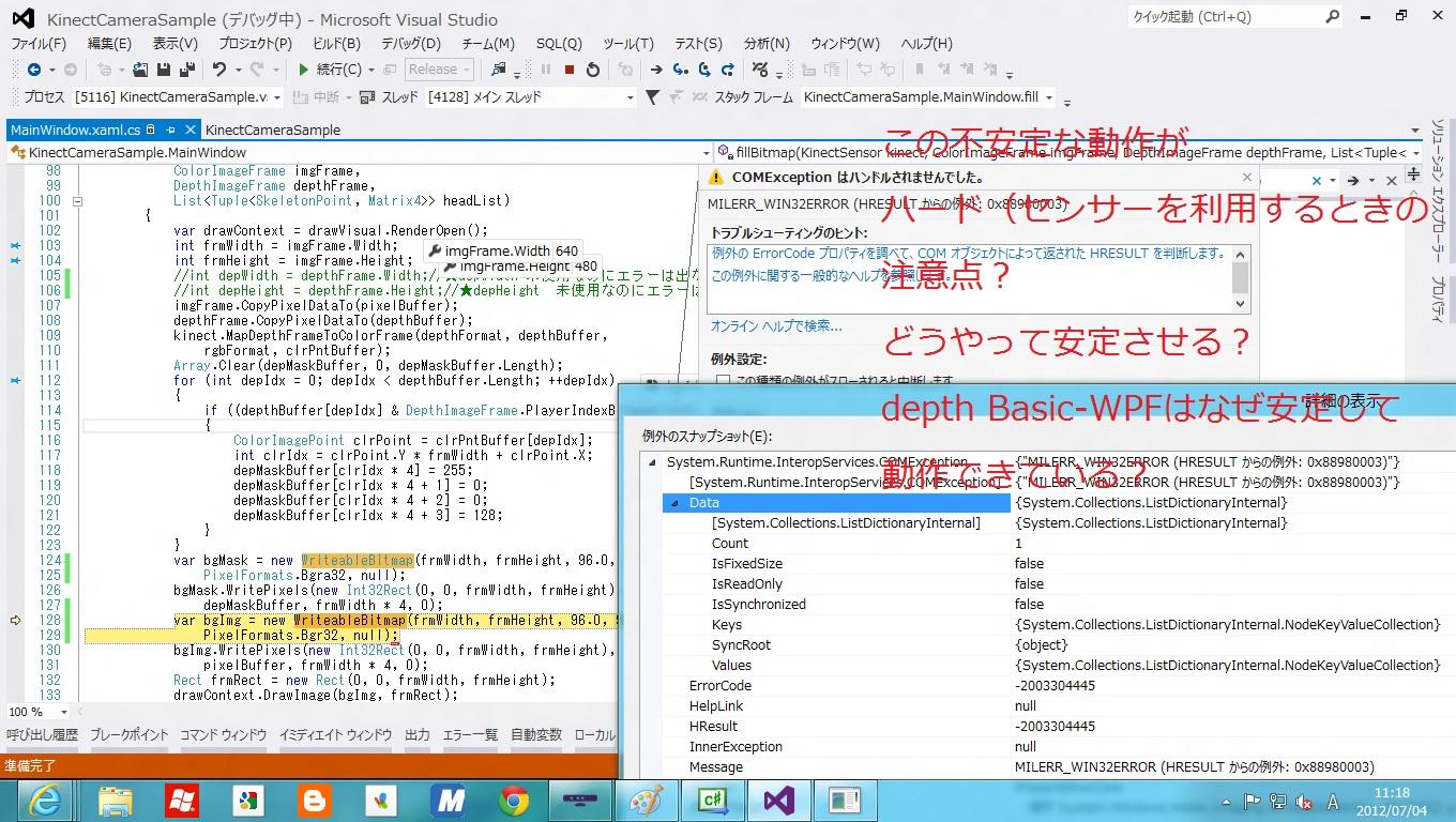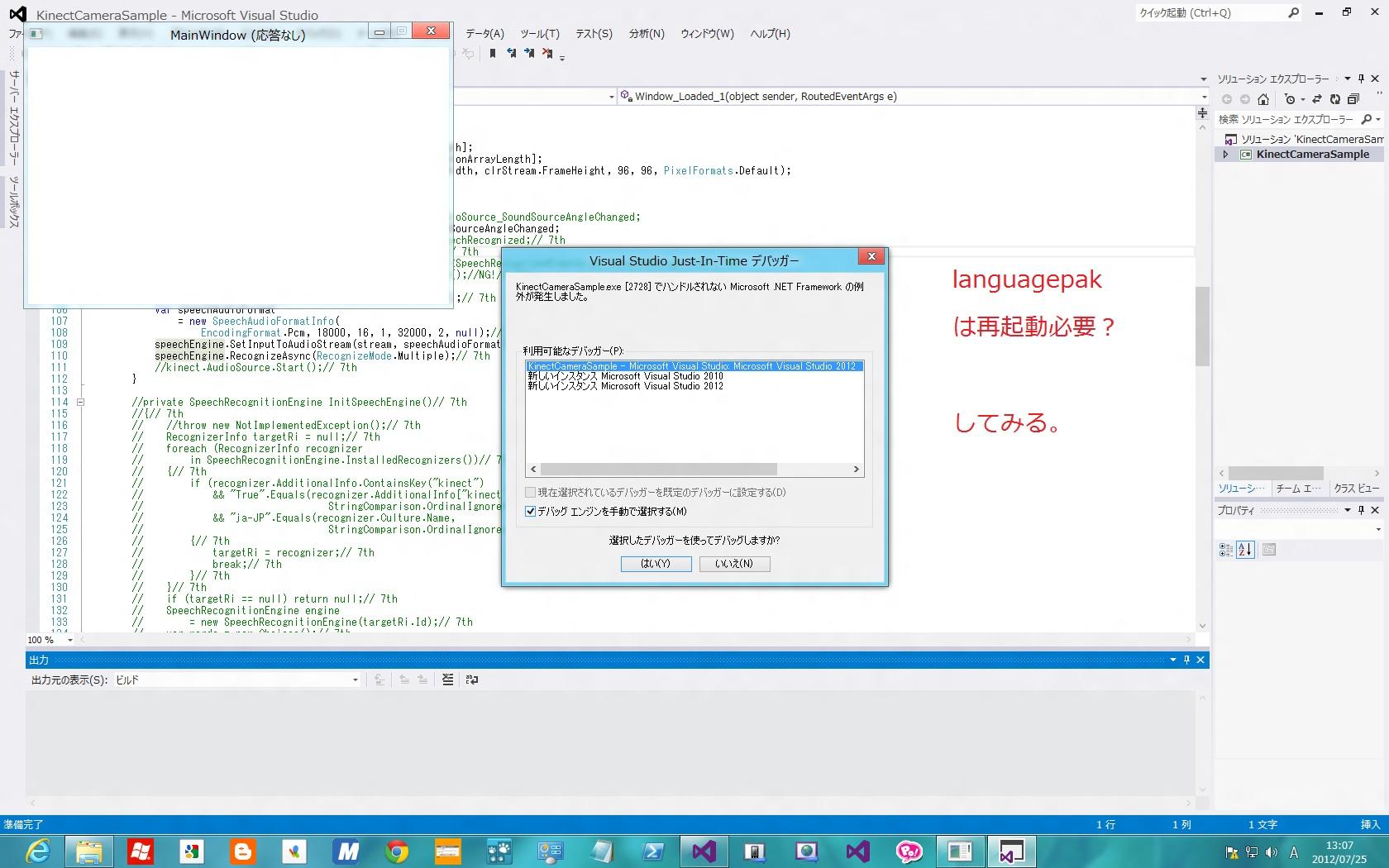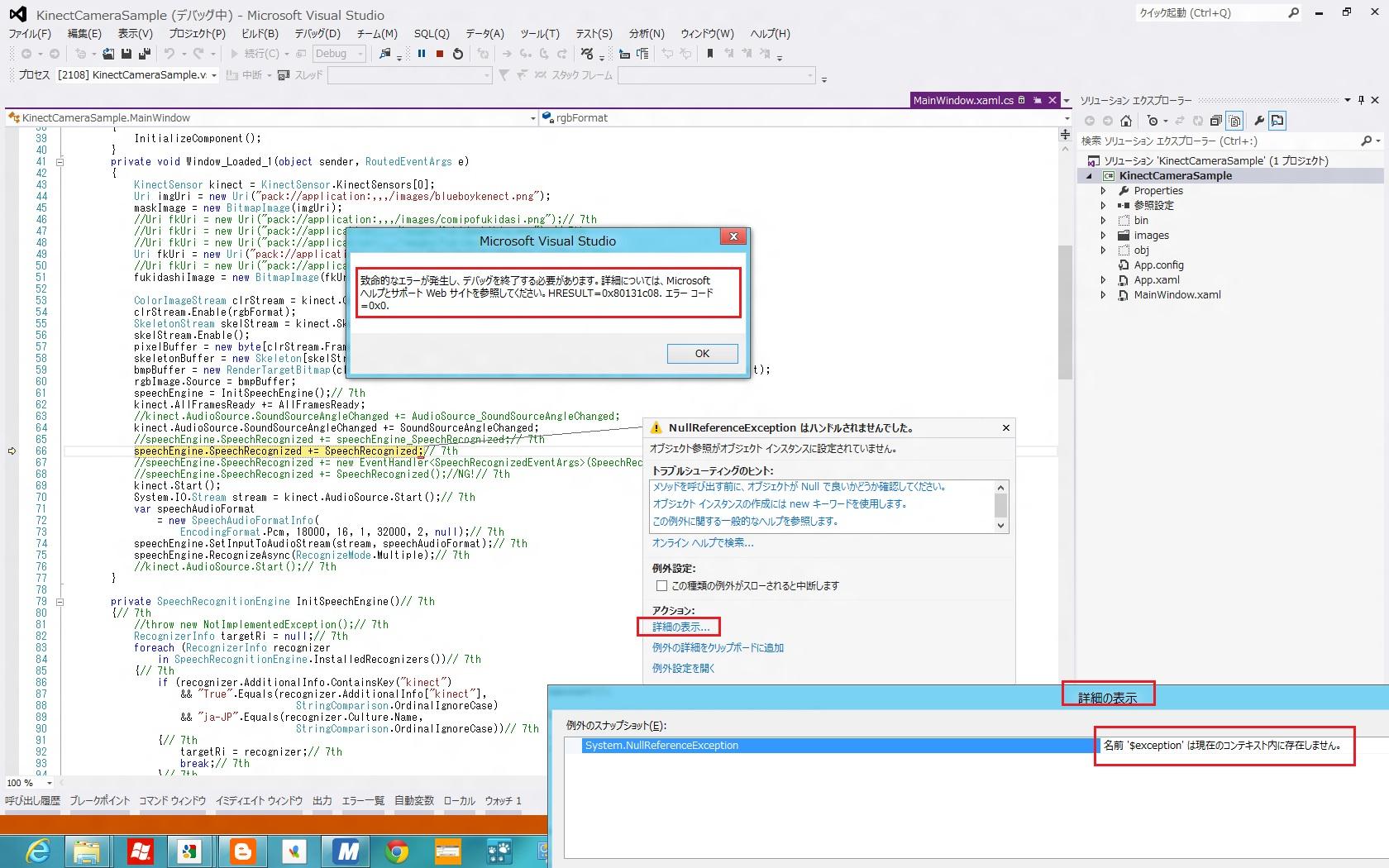 次はハンズオンテキストがそのままではエラーばかりなので、直しながらkinect の理解を深めてゆく。