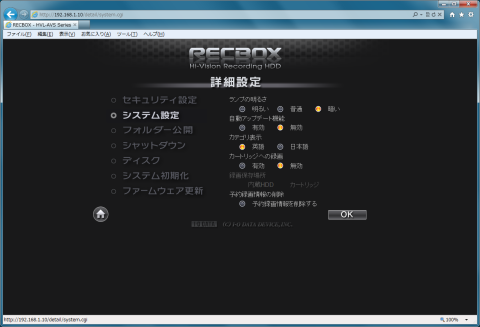 他には「システム設定」の「ランプの明るさ」を「暗い」に、「自動アップデート機能」を「無効」に設定、「ディスク」の「省電力設定」を「10分後」にしました。この辺りの設定は好みや使い方にあわせて選びます。