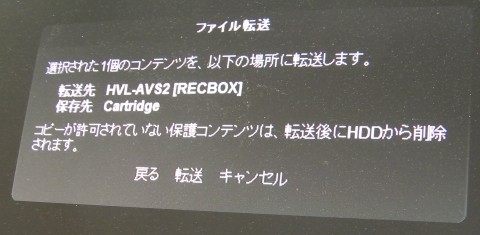 転送先に「HVL-AVS2[RECBOX]」を選択して「次へ」を押し、保存先で「Cartridge」を選択して「次へ」を押します。
