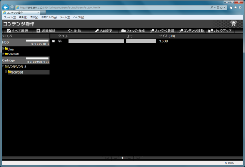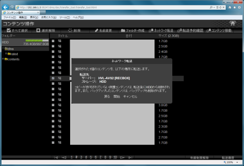 ブラウザでHVL-AVS2.0を開いてコンテンツ操作を選択します。iVDR/iVDR-S\recordedを開いてダビングしたいコンテンツにチェックを入れてからネットワーク転送を選択します。