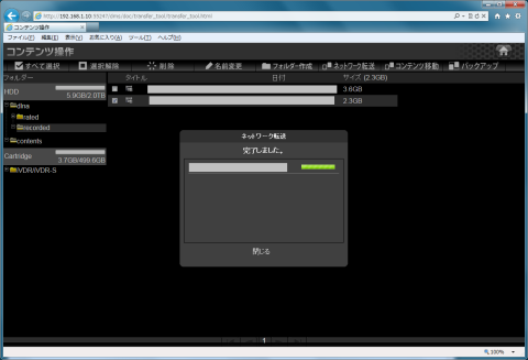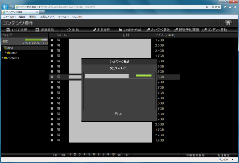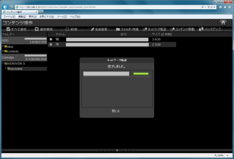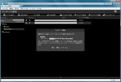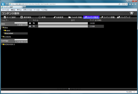 dlna\recordedを開いてダビングしたいコンテンツにチェックを入れてからネットワーク転送を選択します。
