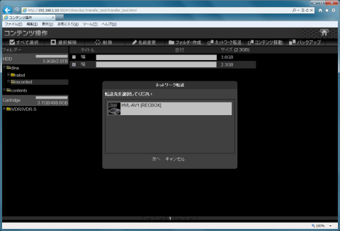 転送先に「HVL-AV1[RECBOX]」を選択して「次へ」を押します。