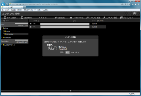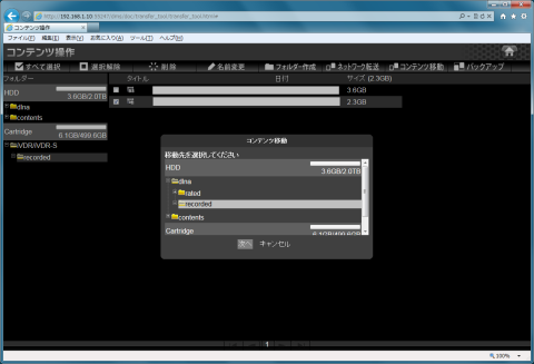 ブラウザでHVL-AVS2.0を開いてコンテンツ操作を選択します。dlna\recordedを開いてダビングしたいコンテンツにチェックを入れてからコンテンツ移動を選択します。