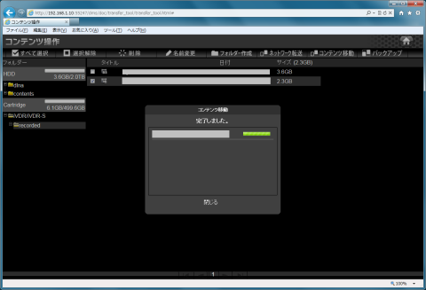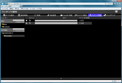 次はiVDR/iVDR-S\recordedを開いてダビングしたいコンテンツにチェックを入れてからコンテンツ移動を選択します。