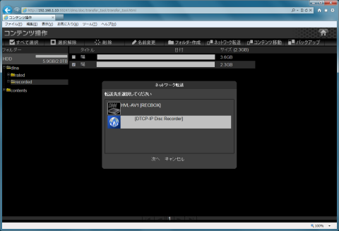 ブラウザでHVL-AVS2.0を開いてコンテンツ操作を選択します。dlna\recordedを開いてダビングしたいコンテンツにチェックを入れてからネットワーク転送を選択します。転送先に「コンピューター名[DTCP-IP Disc Recorder]」を選択して「次へ」を押します。