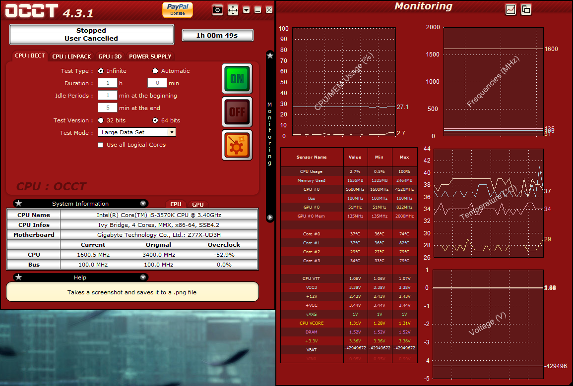 こちらは試運転後のOCCTのスクショ。各コアの試運転時の最大温度が表示されてます