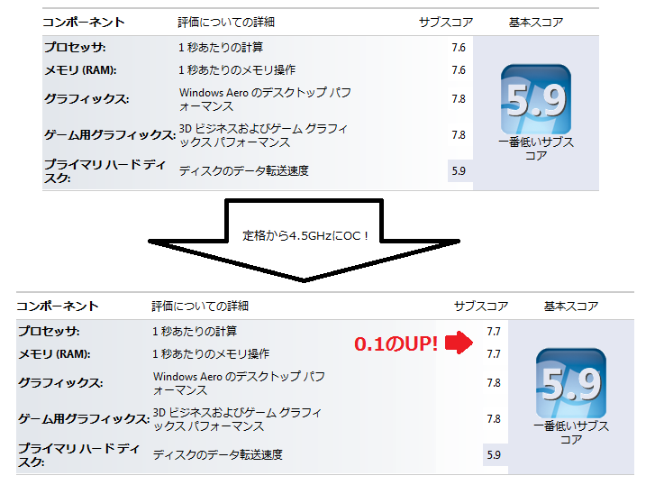 OCなしで3570Kだと7.6まで上がりました(4.5GHzOC時は7.7)