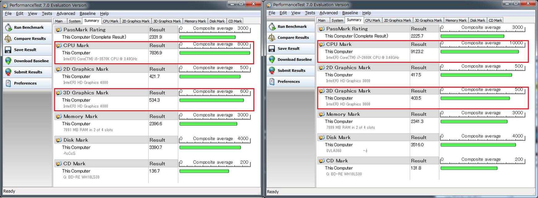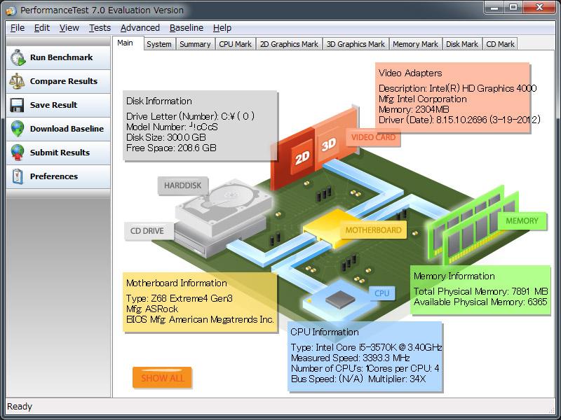 PassMarkの「PerformanceTest7.0」と言う総合ベンチマークソフトを使用しました。