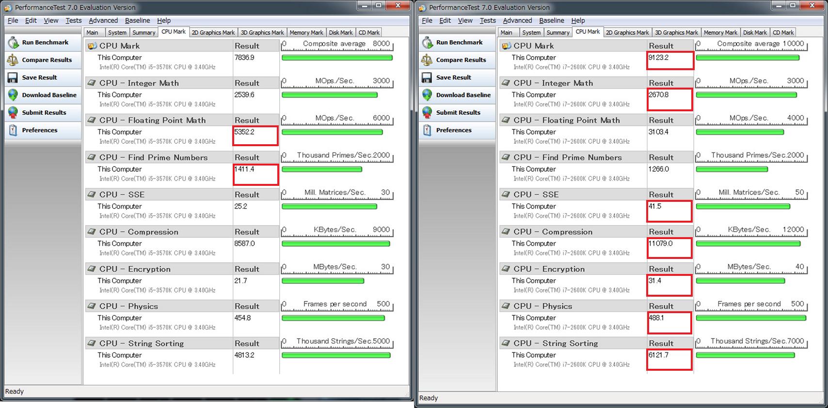 一番上のスコアを見ると、HTを持つ i7-2600K(右) が実力を見せるも、浮動小数点など