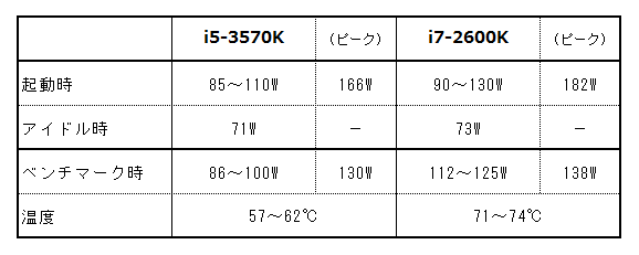 アイドル時はあまり差がありませんが、起動時、ベンチマーク時とも約20Wくらいi5-3570K