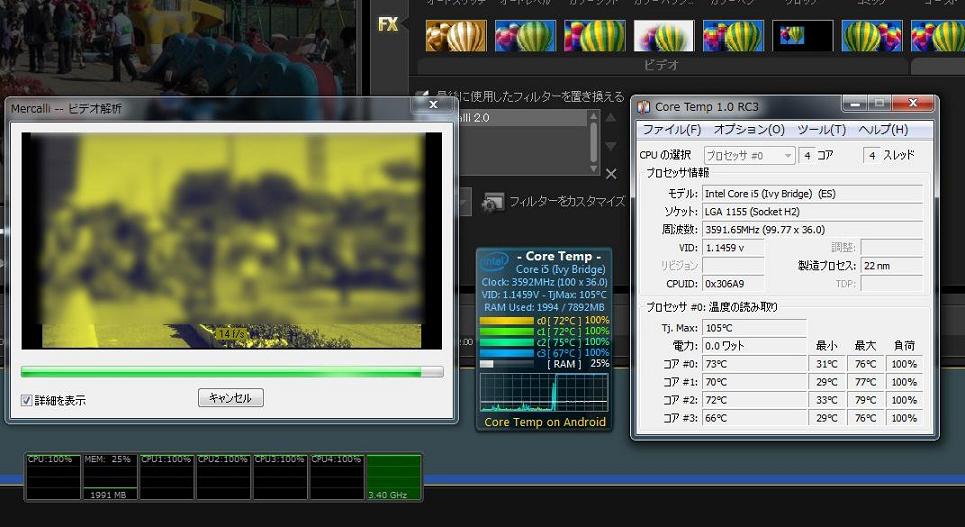CPUの負荷は、手ぶれ解析開始と同時にほぼ100%となり、終了まで続きます。