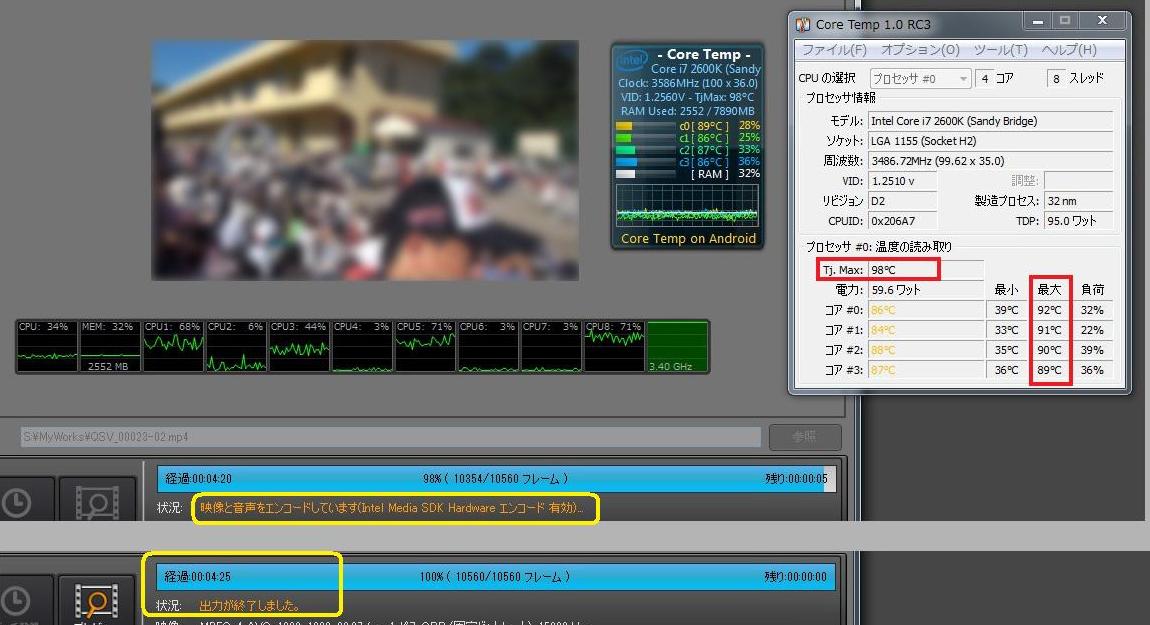 エンコード時間 : 4分 25秒 / 電力 : 137~156W / 温度 : 89~92℃