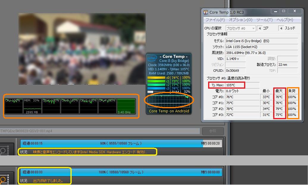 エンコード時間 : 3分 33秒 / 電力 : 132~133W / 温度 : 76~79℃