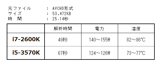 ここ から予測されるのは、HTが無い i5-3570K は、解析時間が倍まではいかなくても、約